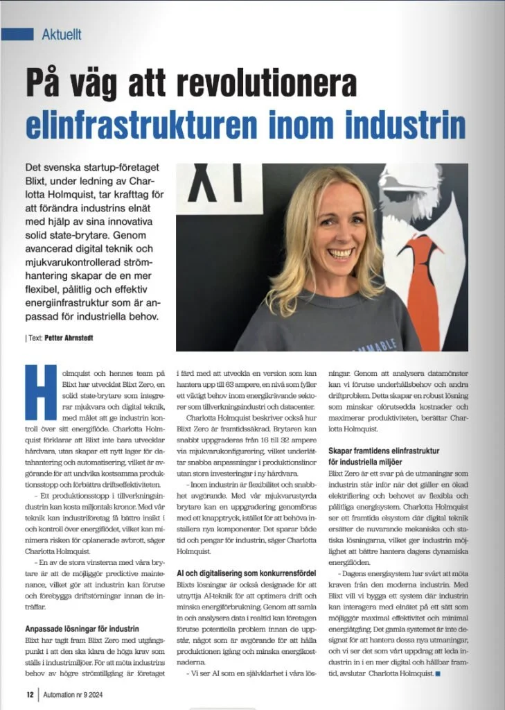 We are proud to be featured in the latest issue of Automation, Sweden’s leading publication on industrial technology and innovation. In the article, our CEO Charlotta Holmquist shares how BL!XT is transforming electrical infrastructure with our solid-state circuit breaker, BL!XT Zero, and groundbreaking AI-driven solutions. By replacing outdated systems with digital technology, we’re driving efficiency, sustainability, and a dynamic energy future.